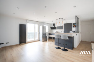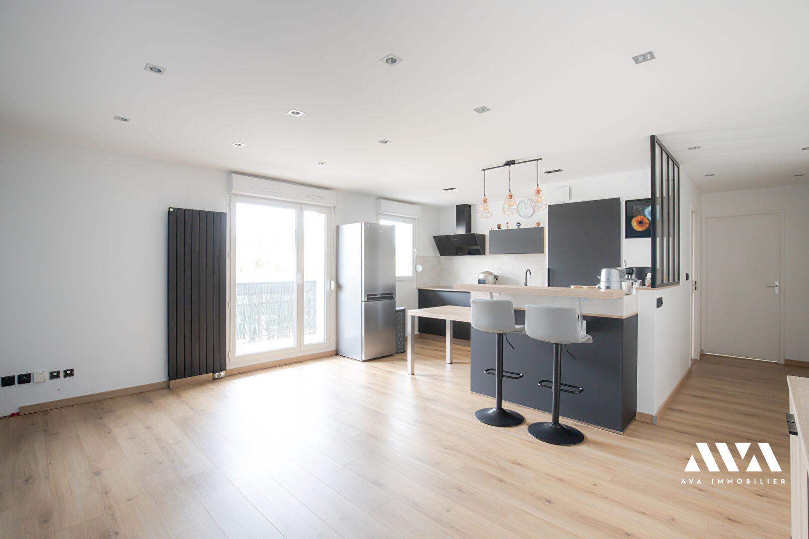 Cet appartement de 61m2 carrez se compose d'une entrée avec dégagement, d'une pièce de vie avec cuisine ouverte et accès direct sur la terrasse, de deux chambres, d'une salle d'eau et d'un wc.