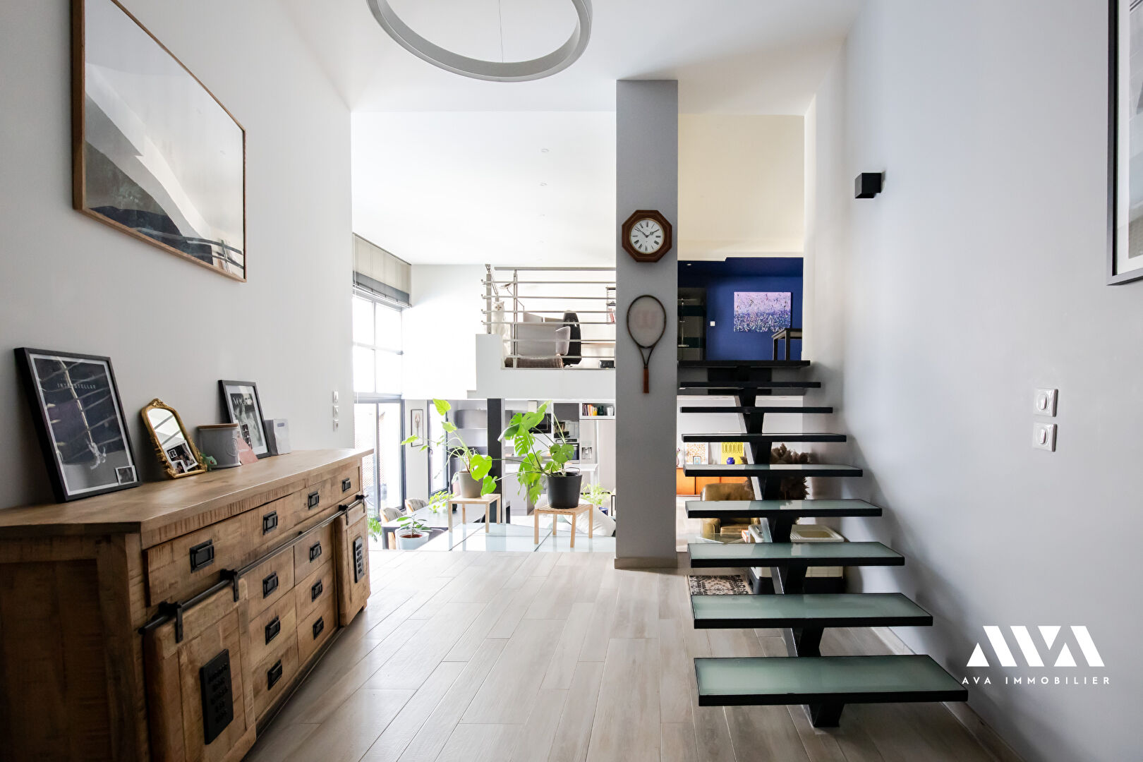 Une vaste pièce de vie avec mezzanine offrant un cachet loft incomparable