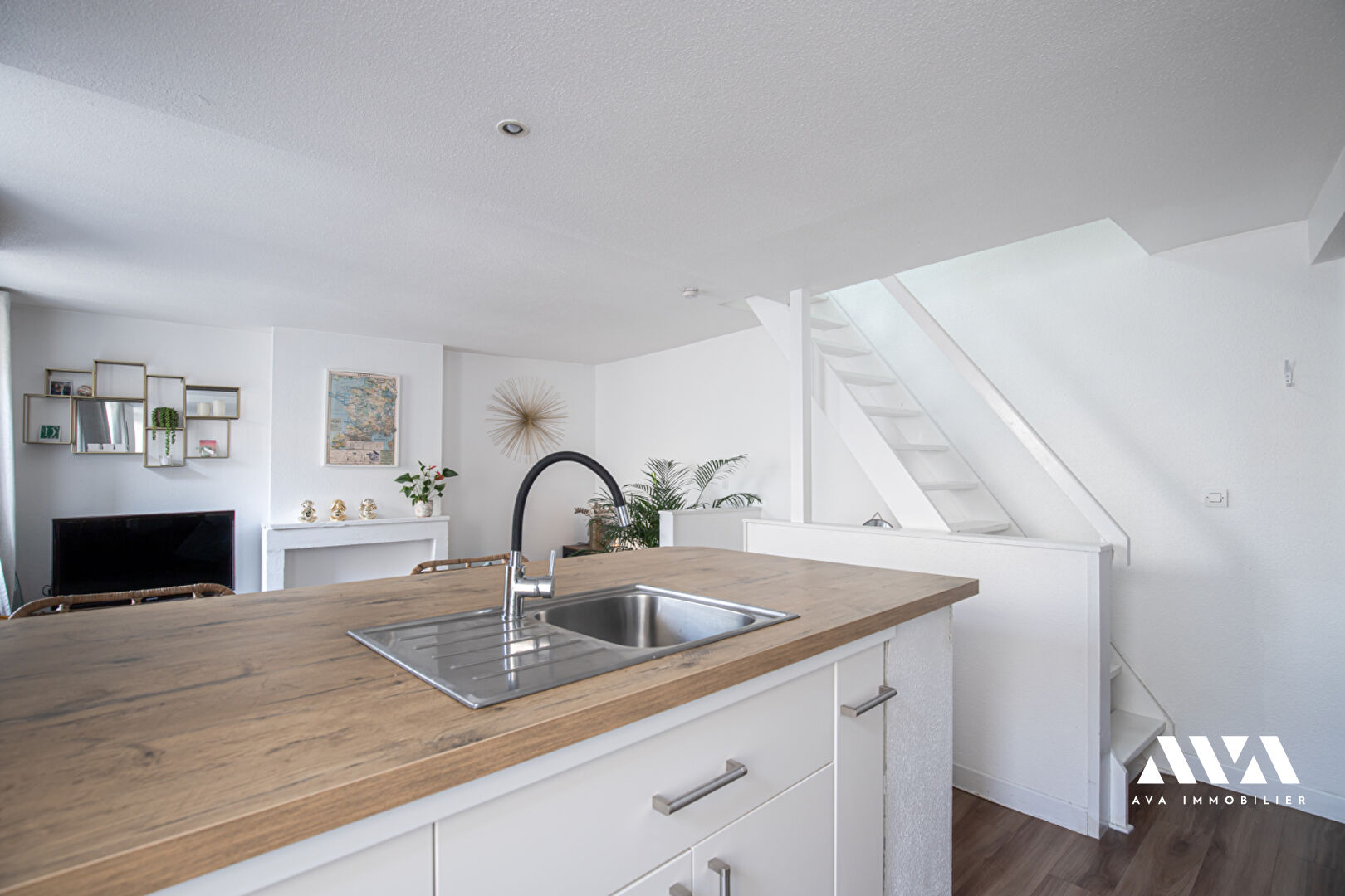 Il se dessert en Triplex : une entrée, une chambre avec rangements, une salle d'eau avec buanderie, une cuisine ouverte sur le salon-séjour, une chambre au dernier étage et un grenier.