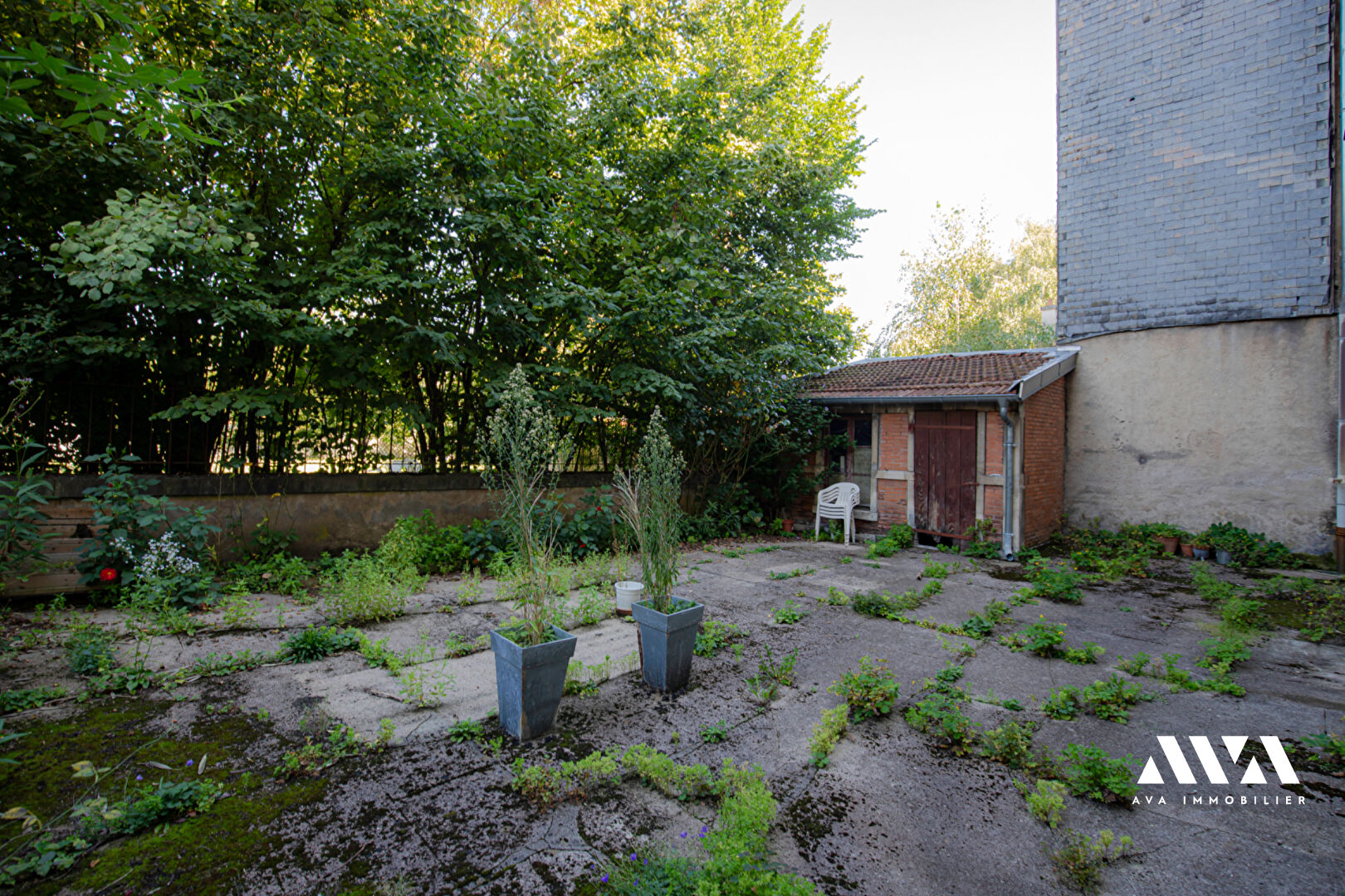 Une cour avec remise pour vélo en commun.