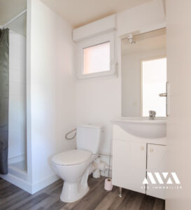 En rez-de-chaussée donnant sur la cours intérieur du bâtiment il se dispose comme suit : une pièce de vie principale avec cuisine ouverte comprenant plaque de cuisson, petit réfrigérateur et micro-onde ainsi qu'une salle d'eau avec WC.